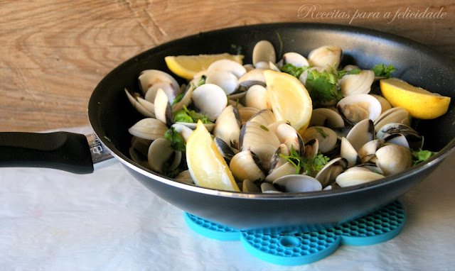 Lavar as amêijoas para retirar todo e qualquer resíduo de areia. Deixar de molho por duas horas,com um pouco de sal e uma colher de sopa de farinha (opcional).