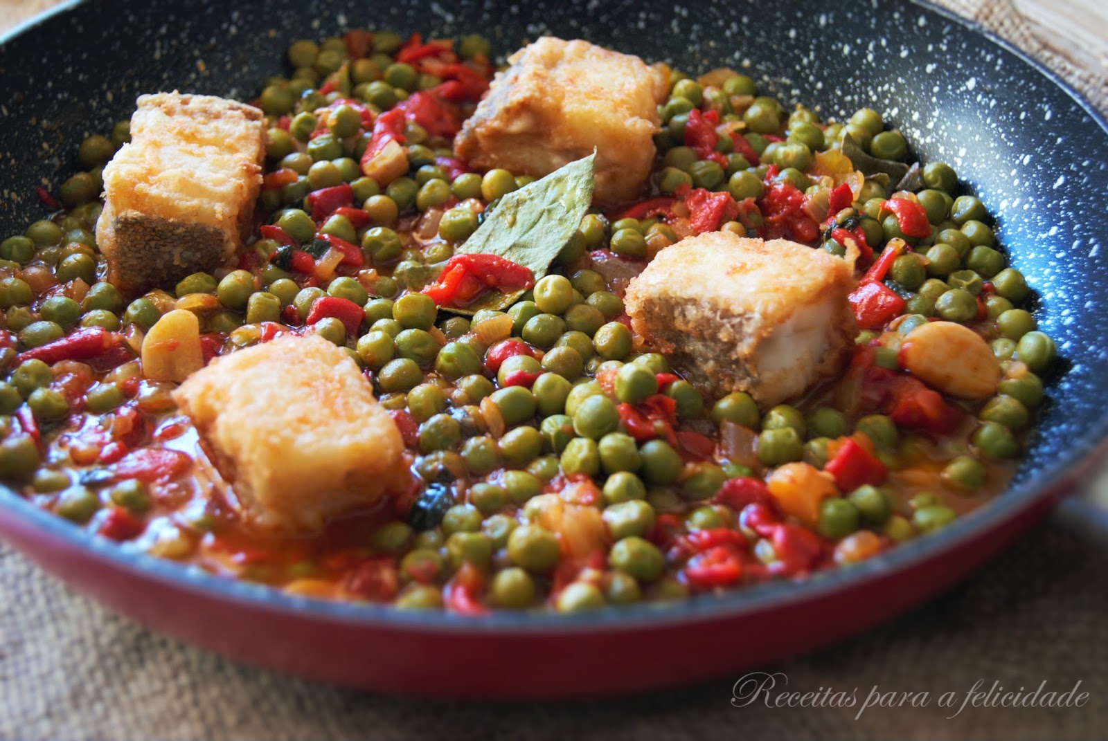 Na mesma frigideira onde fritou o bacalhau, retire parte do azeite e refogue no restante a cebola, a folha de louro e o dente de alho. Assim que estiver dourada junte a salsa picada e a paprika. Mexa e se estiver muito seco junte ao refogado, um pouco de água da cozedura das ervilhas.