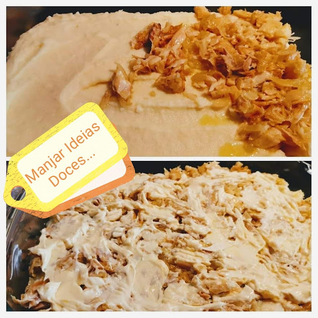 - Num pirez de ir ao forno, deitar no fundo a cobrir, uma camada de puré de batata, por cima a cebolada com o bacalhau, espalhe a maionese e cubra com nova camada de puré de batata, faça uns desenhos com um garfo.