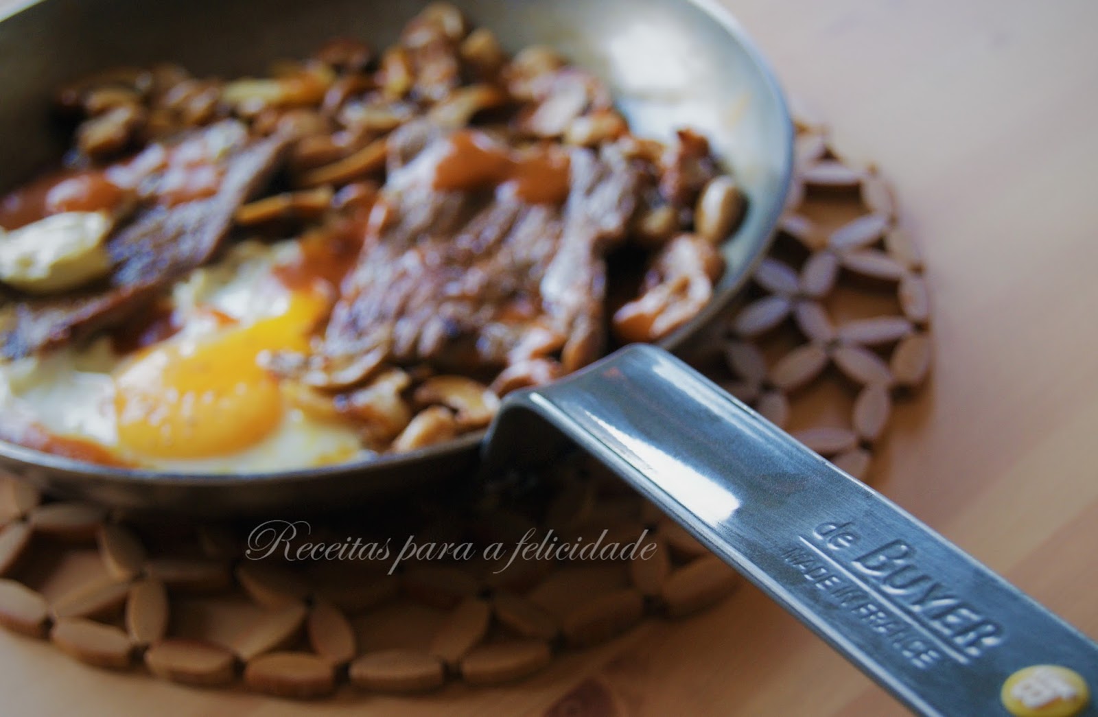 Coloque na frigideira um fio de azeite e os dentes de alho esmagados. Junte depois os cogumelos depois de bem escorridos, e deixe-os saltear até ficarem dourados. Tempere os bifes de sal e pimenta e junte-os também à frigideira virando de ambos os lados até ficarem no pronto pretendido (eu gosto bem passados). Regue com um fio de molho caseiro de francesinha e deixe ferver.