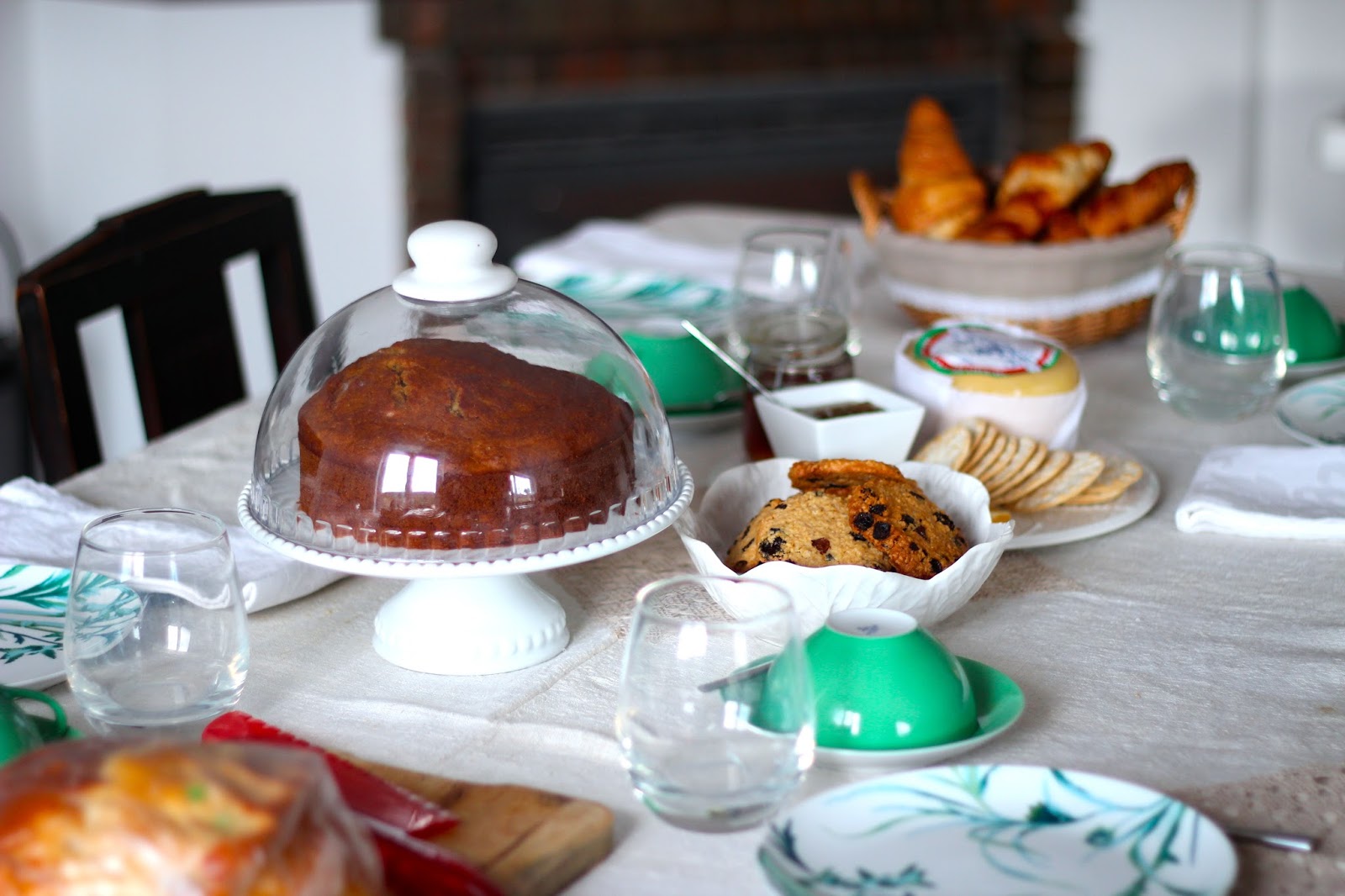 Uma mesa posta com coisas simples: chá quente, sumo de laranja, pasteis de natas feitos em casa, mas muito feios e com alguns outros problemas, morcela frita da prima Isabel, queijo da Serra do Elídio, que o avô me tinha trazido na semana anterior, compotas caseiras, bolo de Ançã, broa e pão, presunto e fiambre, bolachinhas de aveia e passas, iogurte caseiro e ainda um bolo simples de cenoura, laranja e amêndoa do qual vos deixo a receita.