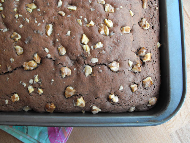 Colocar a massa na forma e polvilhar com algumas nozes picadas. Levar ao forno cerca de 30-35 minutos ou até o bolo estar cozido (não convém cozer demais! É bolo de chocolate!).