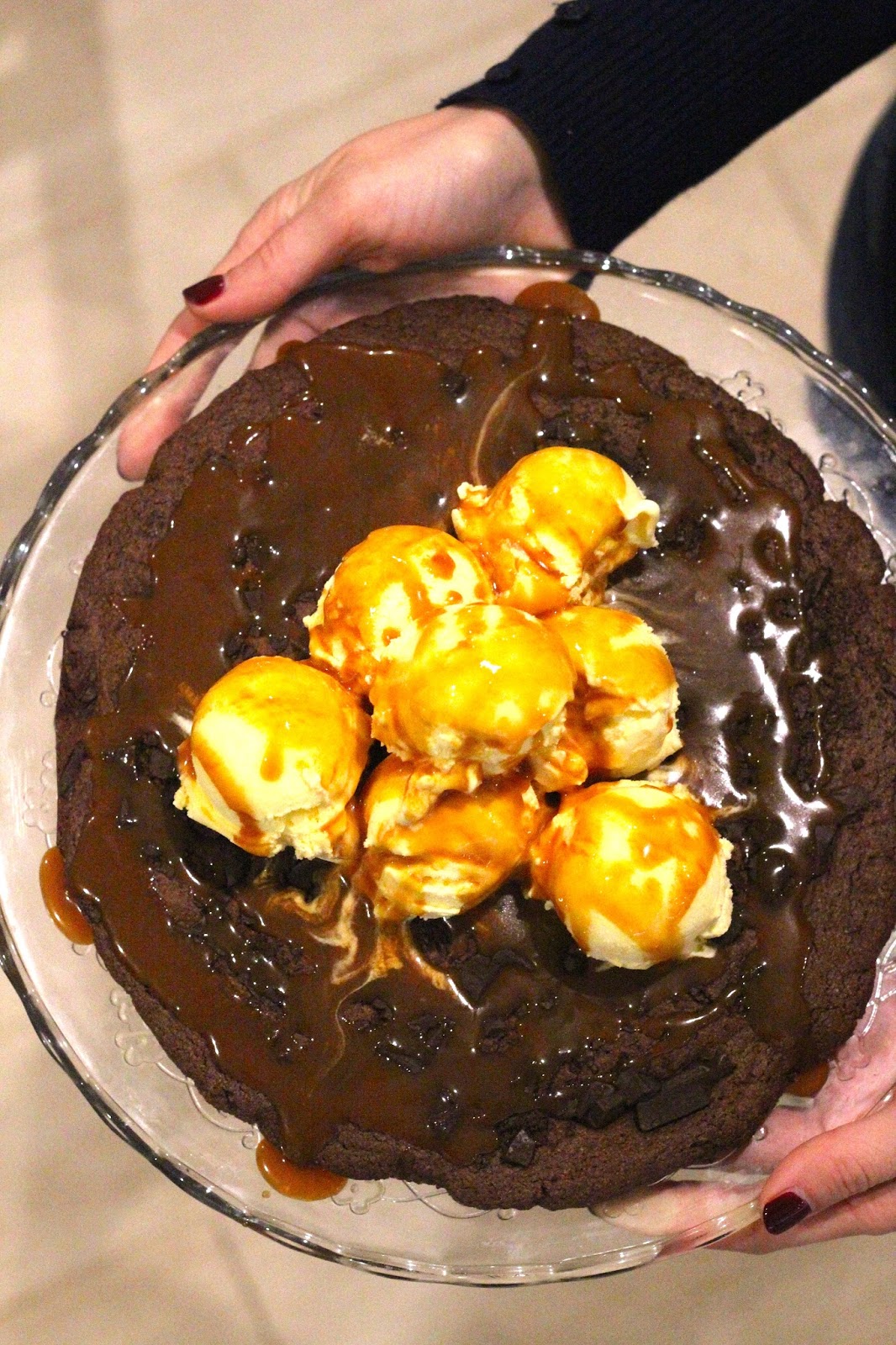 Sirva a bolacha com algumas bolas de gelado e com o molho de caramelo salgado. Leve para a mesa e partilhem todos (ou corte em fatias!)