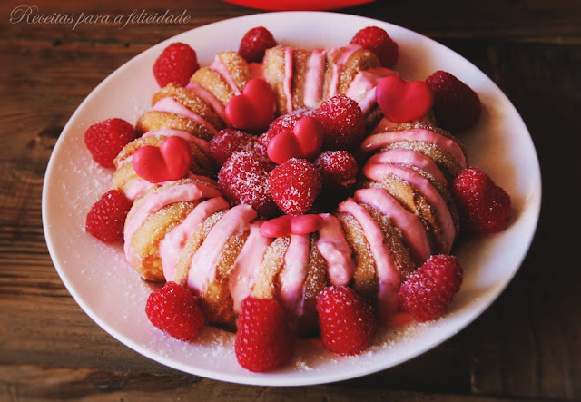 Recheei com uma deliciosa mistura de queijo creme e doce de framboesas, decorei com a ajuda da Vahiné, com estes doces e preciosos corações de açúcar, e este foi o resultado final.