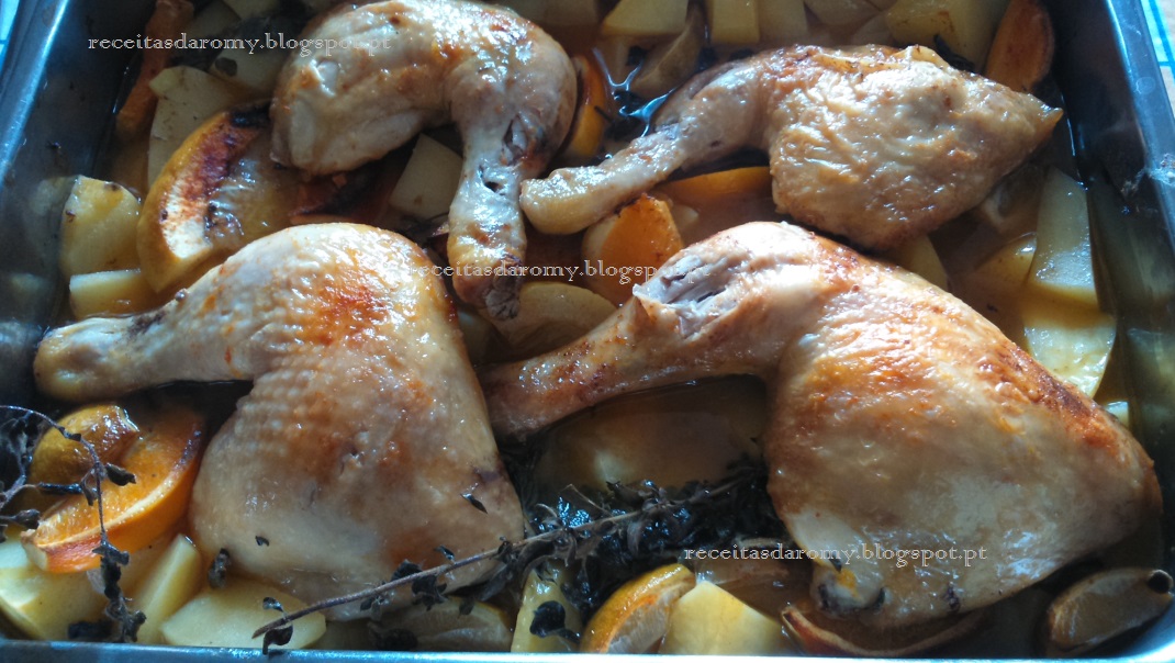 - Coloque o frango e as batatas no tabuleiro de forno.