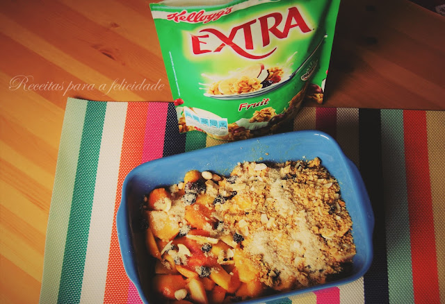 Envolva a fruta com o extracto de baunilha. Triture ligeiramente os cereais de aveia e fruta da Kellogg´s e polvilhe sobre a fruta, de modo a esta ficar bem coberta.