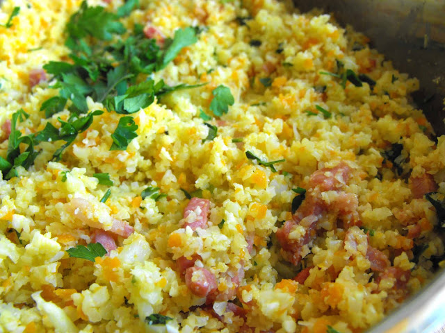 Num robot de cozinha ou picadora colocar os ramalhetes da couve-flor e picar até ficar com a aparência de grãos de arroz. Junta À frigideira com o bacon. Picar também a cenoura e juntar à couve-flor. Envolver e manter em lume baixo, mexendo ocasionalmente.
