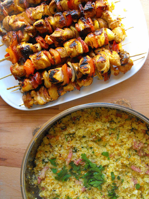 Mais uma semana que se inicia. Este Janeiro é qualquer coisa de interminável e já vamos na quinta segunda-feira!!! Fevereiro vem aí, um mês mais simpático, curto e que num instante nos deixa em Março, mês em que começa a minha querida Primavera! Daí até ao Verão é outro pulinho! Já estou fartinha das mãos frias e do pingo no nariz, apesar das alergias não me darem tréguas na Primavera… mas bom, não se pode ter tudo. No fim-de-semana passado fiz este almoço, mais demorado, que dificilmente temos oportunidade de fazer durante a semana, mas que compensa muito o relativo trabalho que dá. Na realidade só requer alguma preparação. Em termos práticos é facílimo, mas as espetadas demoram o seu tempo na grelha, coisa que durante a semana é muito pouco! Para acompanhar saiu desta vez um leve “arroz” de couve-flor que é delicioso! Quem ainda não experimentou não sabe o que perde!