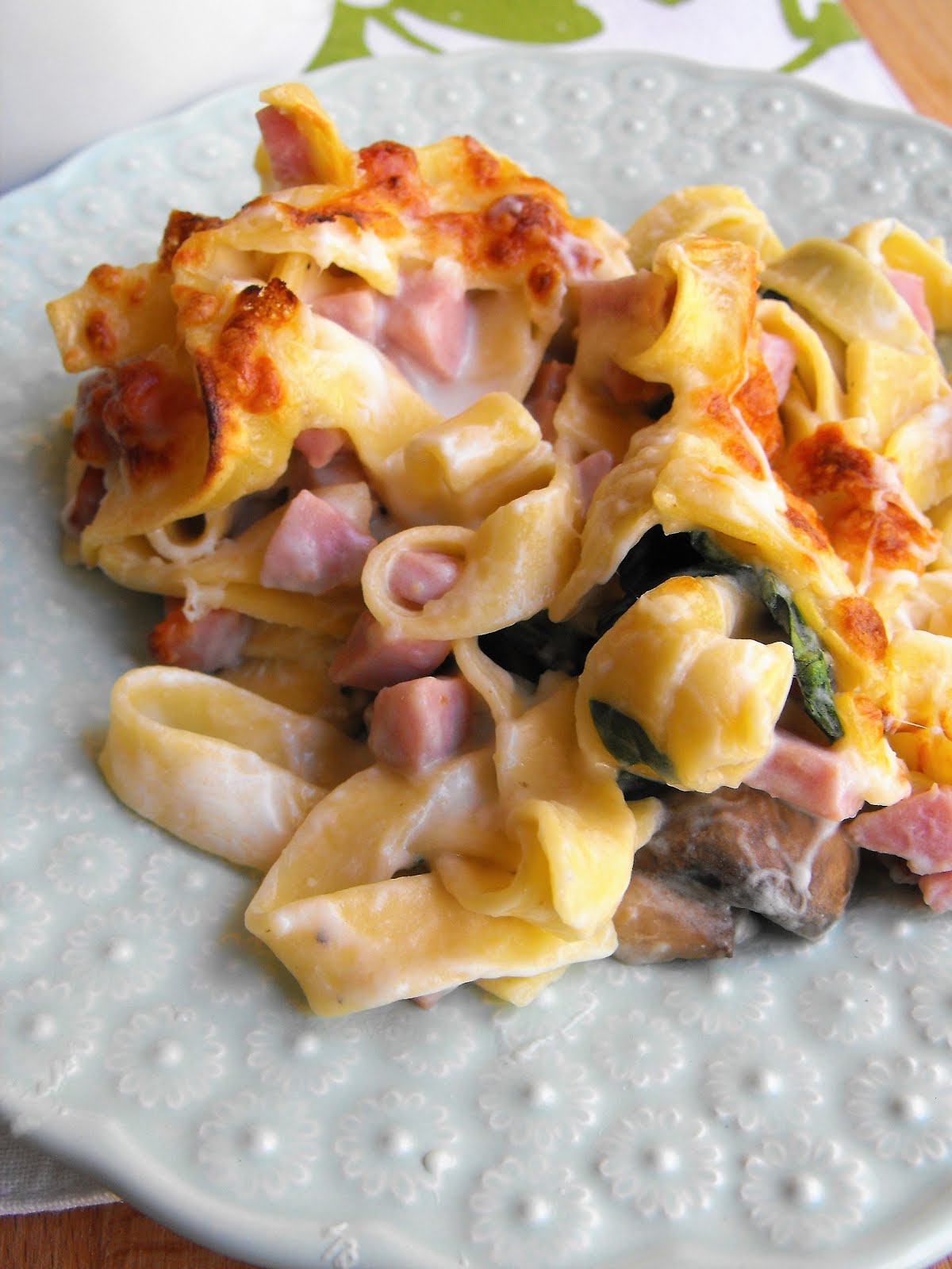 Nestes primeiros dias de Primavera, confesso, até não me importo de apanhar trânsito… com os devidos limites, obviamente! Mas aquelas filas voltadas a nascente, com o solinho morno da manhã a bater no corpo… até levanto a pala e deixo o sol bater na cara. Fecho os olhos, levanto a música e vou espreitando aqui e ali se o sinal já abriu ou se posso continuar em modo osga! Hoje foi uma dessas manhãs… sol na cara, a ouvir a bonita Carolina Deslandes e o eterno Rui Veloso que me fazem voar num avião de papel para bem longe daqui, para lugares quentes, cheios de aromas familiares, com todas as minhas pessoas… podia ficar nesses momentos tempo sem fim… mas de volta à realidade dos dias, as minhas pessoas também precisam de comer! E gostam de comer! E gostaram muito desta sugestão que hoje vos deixo. Fettuccine com bife de fiambre, cogumelos e espinafres… simples, rápido e delicioso!