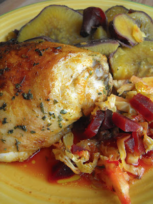 Pré-aquecer o forno a 180.ºC. Num tabuleiro de forno colocar o alho francês cortado em rodelas finas, o aipo cortado em pedacinhos, as folhas de couve em juliana e a beterraba em cubos. Espalhar de forma a cobrir todo o fundo. Por cima colocar as peças de frango. Regar com um fio de azeite e levar ao forno cerca de 45-50 minutos. Retirar do forno e servir o frango com os legumes juntamente com outro acompanhamento, no nosso caso batata doce apenas cozida.