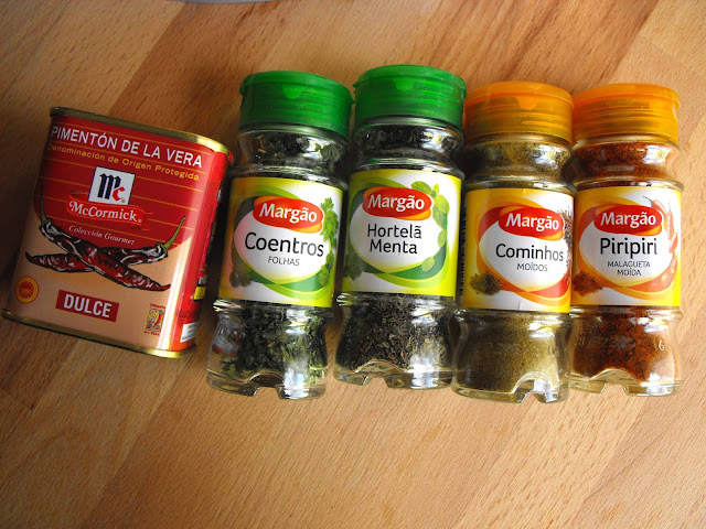 A semana passada recebi o kit promocional da Margão com as novas tendências de sabores. Confesso que adoro especiarias e tenho dois tabuleiros cheios de frasquinhos que adoro usar. O uso das ervas no tempero pode reduzir bastante o consumo de sal na confecção dos nossos pratos e recorro muitas vezes a isso, uma vez que sou hipertensa. Como já tinha posto a descongelar umas coxas de frango para o almoço de sábado, algumas das novas especiarias tiveram logo bom uso. Ficou um tabuleiro colorido, também com a ajuda dos legumes, mas especialmente muito saboroso.