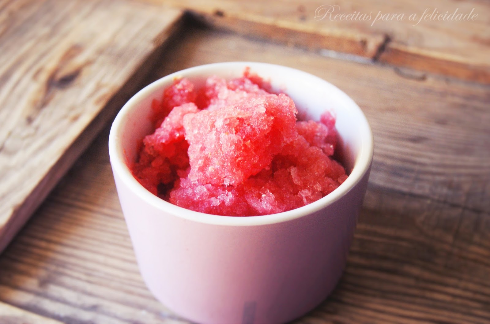 Coloque a mistura num recipiente que possa ir ao congelador (eu coloquei na própria casca da melancia, depois de lhe ter retirado toda a polpa) onde deve ficar por 3 a 4 horas, raspando com um garfo de vez em quando, para se certificar de que congela uniformemente.