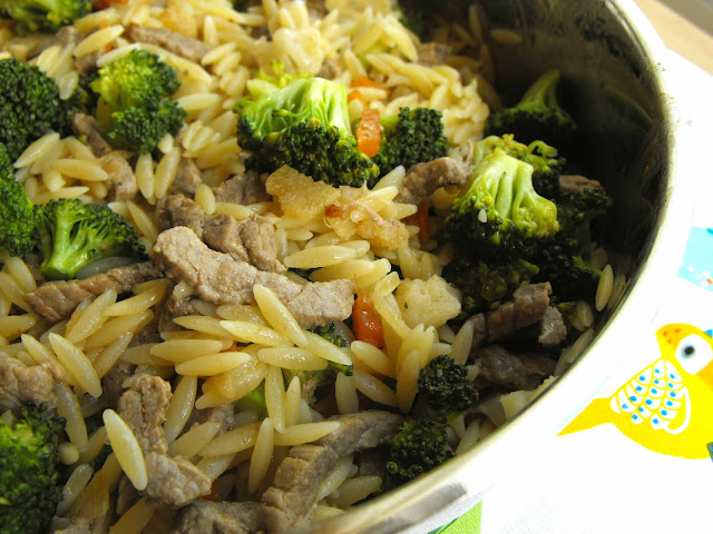 Levar uma frigideira ao lume com uma colher de sopa de manteiga ou margarina vegetal e os dentes de alho picados. Quando estiver derretida juntar os bifes já cortados, temperar com um pouco de sal e pimentão-doce e deixar alourar um pouco. Juntar os ramalhetes de brócolos e deixar cozinhar uns minutos até os brócolos estarem macios. Por fim adicionar os pickles picados e as massinhas e envolver.