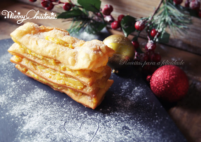 Com muito cuidado, coloque sobre um rectângulo de massa o doce de ovo com amêndoa. Por cima novo rectângulo, novamente o doce de ovo Dulcis e assim sucessivamente sendo a ultima camada, o rectângulo de massa com o golpe.