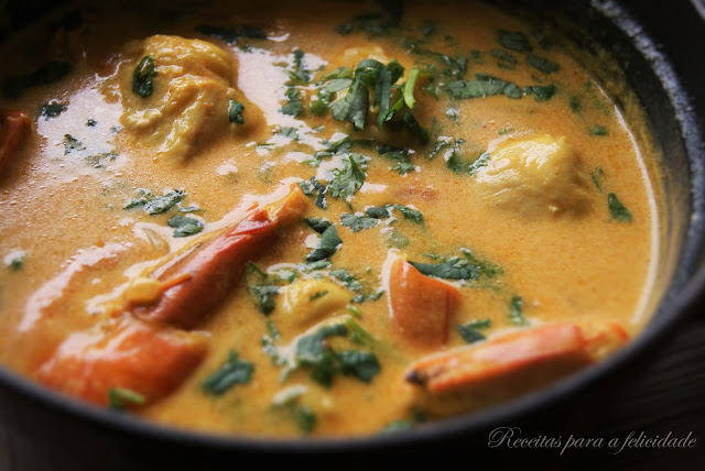 Deixe refogar até a cebola ficar macia. Junte depois o tomate picado e os pimentos, cortados em cubos e mexa. Adicione o açafrão, o leite de coco e tempere de sal e pimenta.