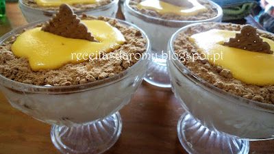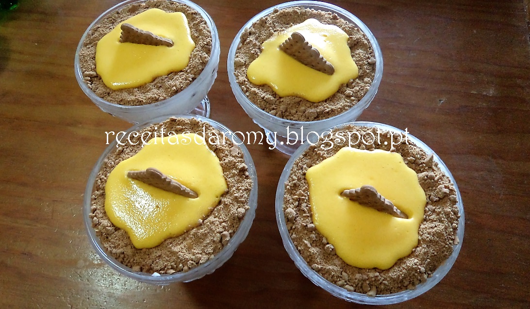 A ultima camada será de creme de natas. Polvilhe com bolacha ralada e cubra com o doce de ovos. Coloque meia bolacha no meio da taça e leve ao frigorifico para refrescar e até servir.