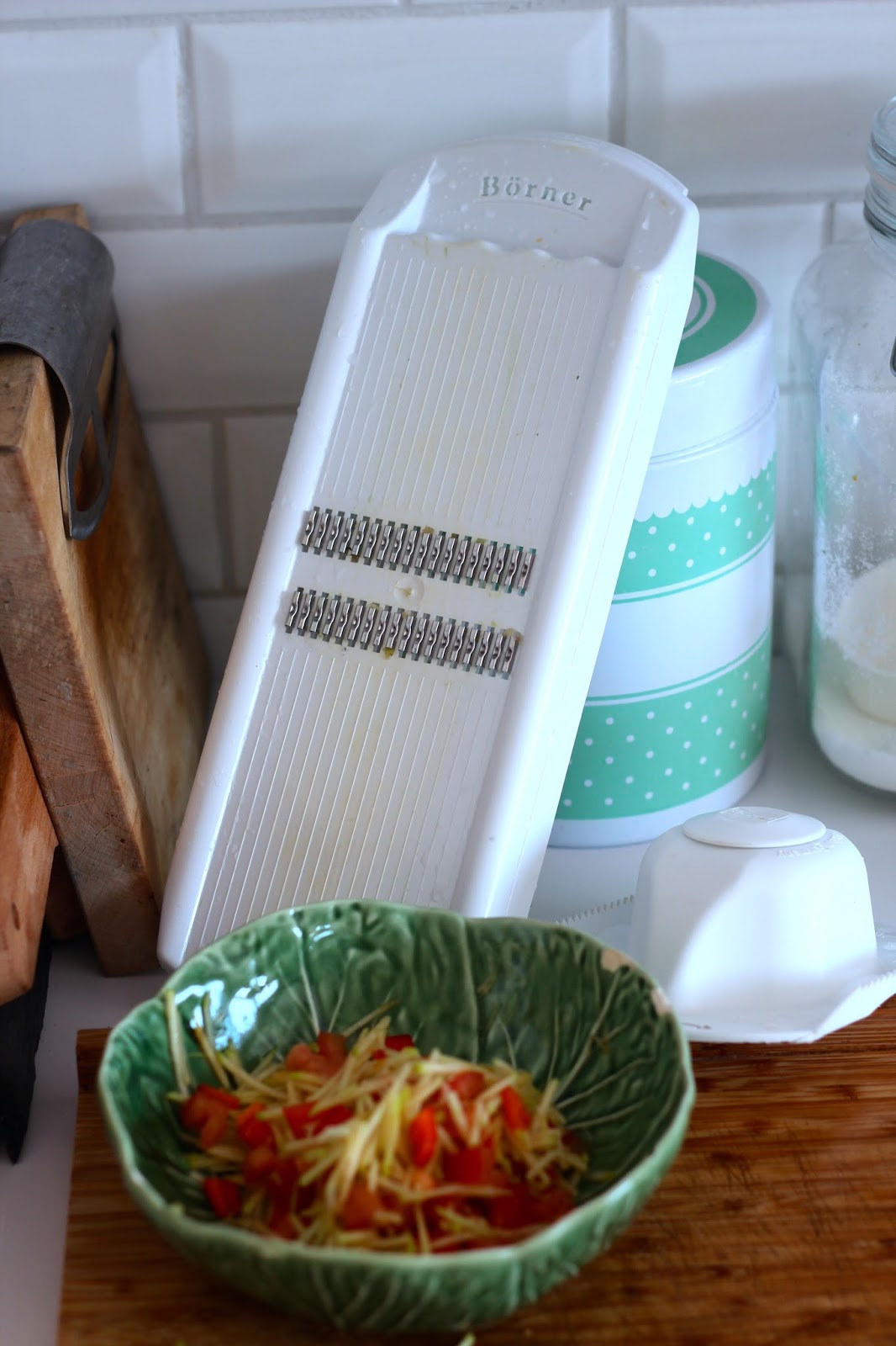 Para fazer a cobertura, (e porque me perguntam isto muitas vezes) usei o acessório ralador da Borner, que adoro, e que faz estes palitinhos finos de maçã e cenoura que adoro para colocar nas saladas. (E usando a cenoura inteirra, batata doce ou courgete, também faz o esparguete de courgete que está agora tão em voga!)