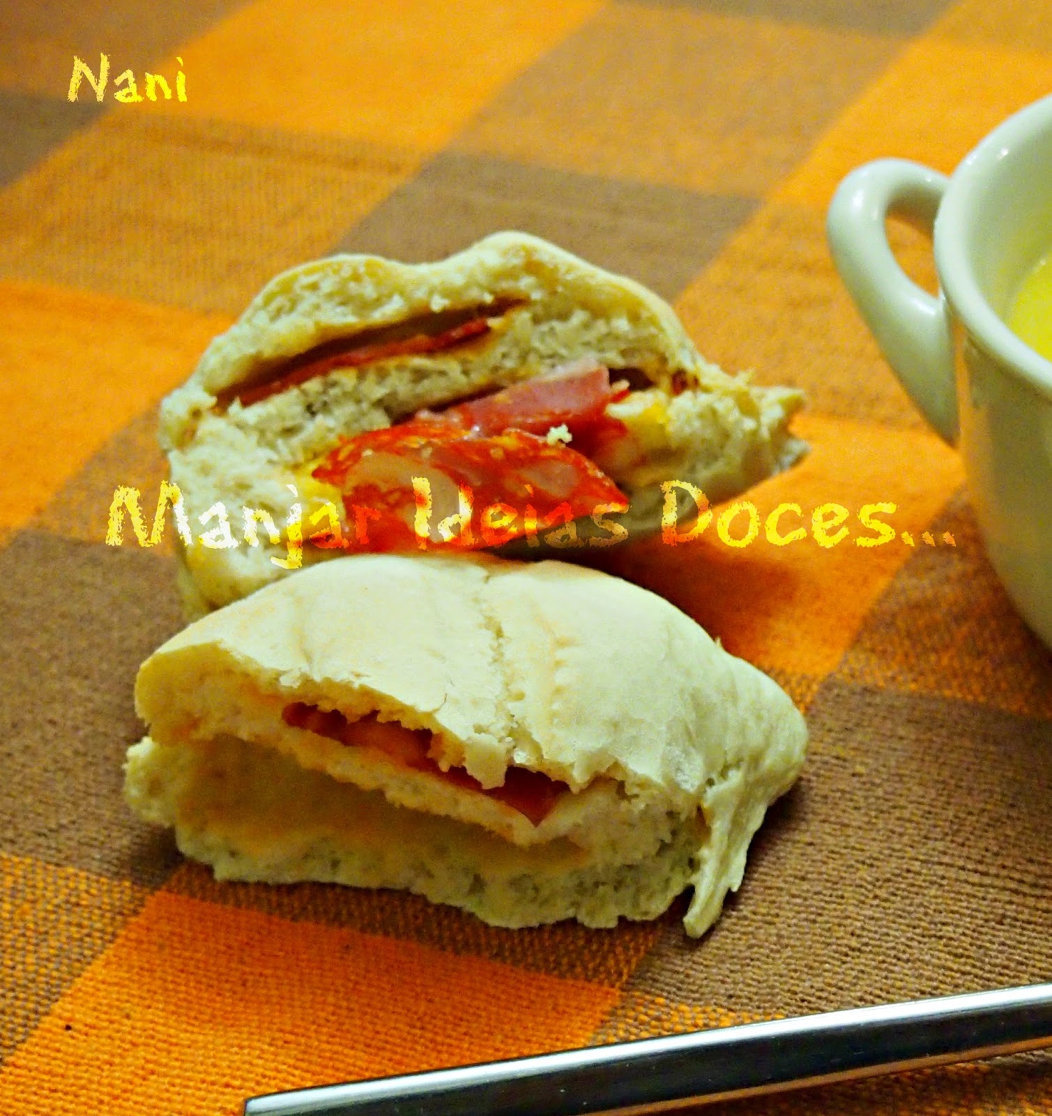 - Retire porções de massa depois de levedada, estenda, recheie com chouriço e forme os pães.