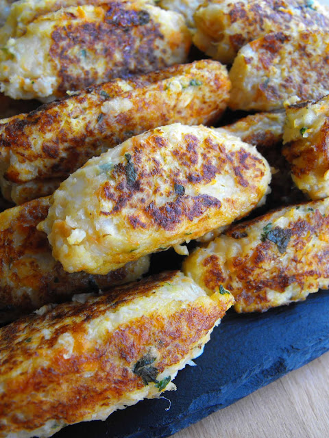 Colocar num robot de cozinha todos os ingredientes dos pastéis e triturar tudo, sem desfazer. Retirar para um prato. Levar uma frigideira antiaderente ao lume, untada com azeite. Quando estiver quente começar a colocar pedaços da massa dos pastéis, enrolados com a ajuda de duas colheres de sopa, como se fossem pastéis de bacalhau. Deixar alourar de todos os lados.