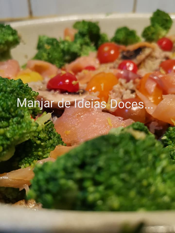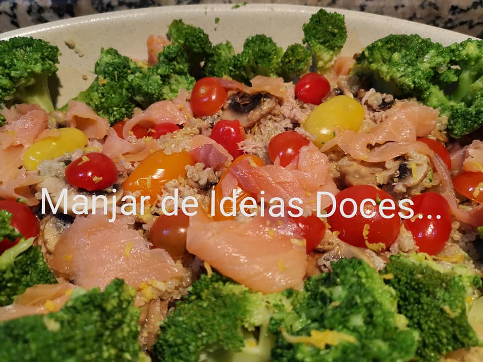 - Numa travessa, deite a quinoa, envolva os cogumelos, o atum, os bróculos, os tomates e o salmão.