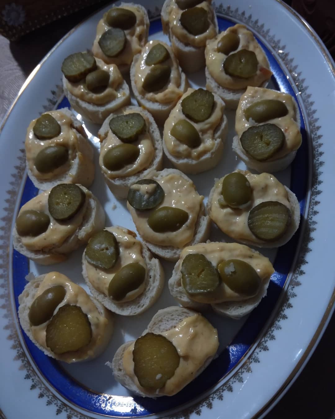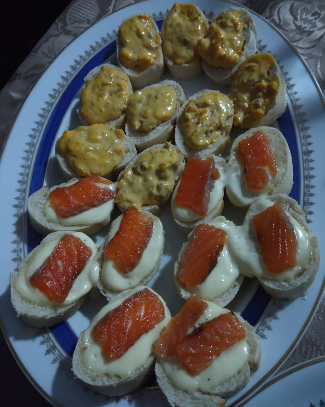 Canapés variados (patê de atum com ovo cozido, maionese e Gravlax de salmão, patê de Gravlax e azeitonas e cornichons)