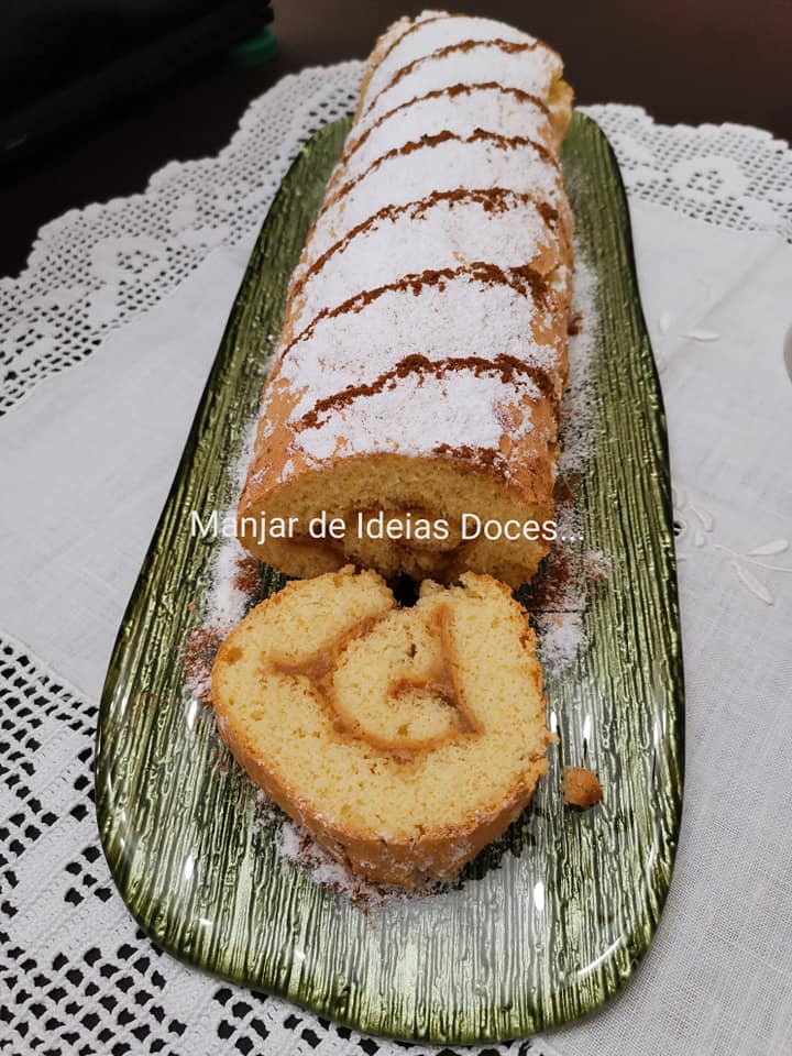 - Verifique com um palito, retire, desenforme em cima de um pano de cozinha, barre com creme a gosto, (no meu caso usei doce de maçã e polvilhei com canela) enrole, coloque num prato de serviço. Por cima polvilhei açúcar em pó e fiz uns traços com canela.