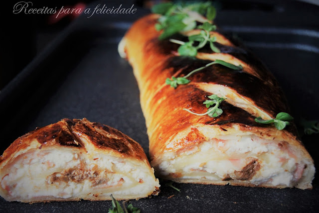 Estenda a massa folhada e cubra-a com o bacon fumado e por cima o queijo ricota e a pasta de azeitona. Polvilhe com as folhas frescas de oregãos e o queijo mozarela ralado e enrole com cuidado.