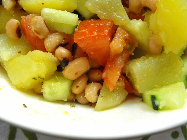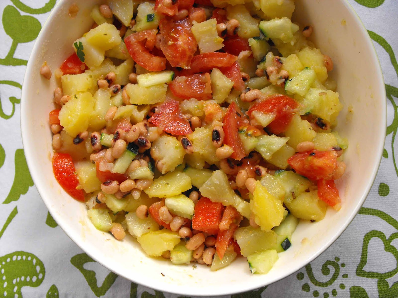 Quando as batatas estiverem frias, juntar o feijão frade bem escorrido e passado por água, o tomate em cubos e o pepino em pedaços pequenos. Adicionar a salsa picada, os orégãos e os restantes temperos. Envolver tudo muito bem e servir.