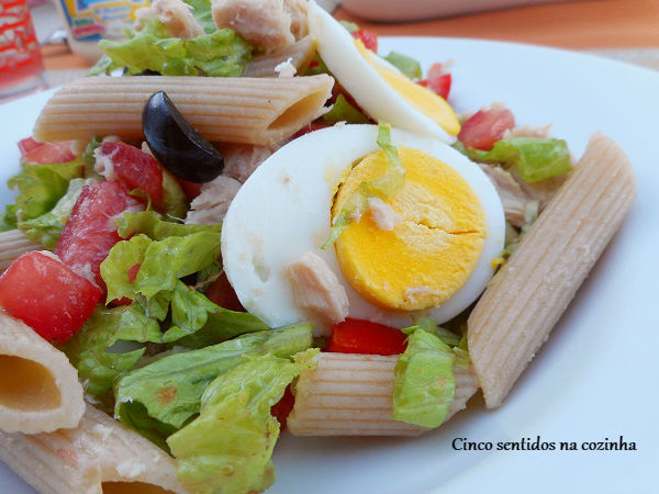 1. Comece por levar ao lume uma panela com água e sal e deixe ferver. Após levantar fervura coloque a massa integral e deixe ferver novamente. Mexa e coza a massa por uns 12 minutos. Depois de cozida escorra-a e passe-a por água fria, deixando-a arrefecer.
