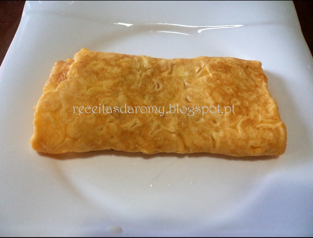 Com uma espátula ou uns hashis (pauzinhos japoneses) vire a omeleta enrolando-a. Deixe-a a um canto da frigideira.