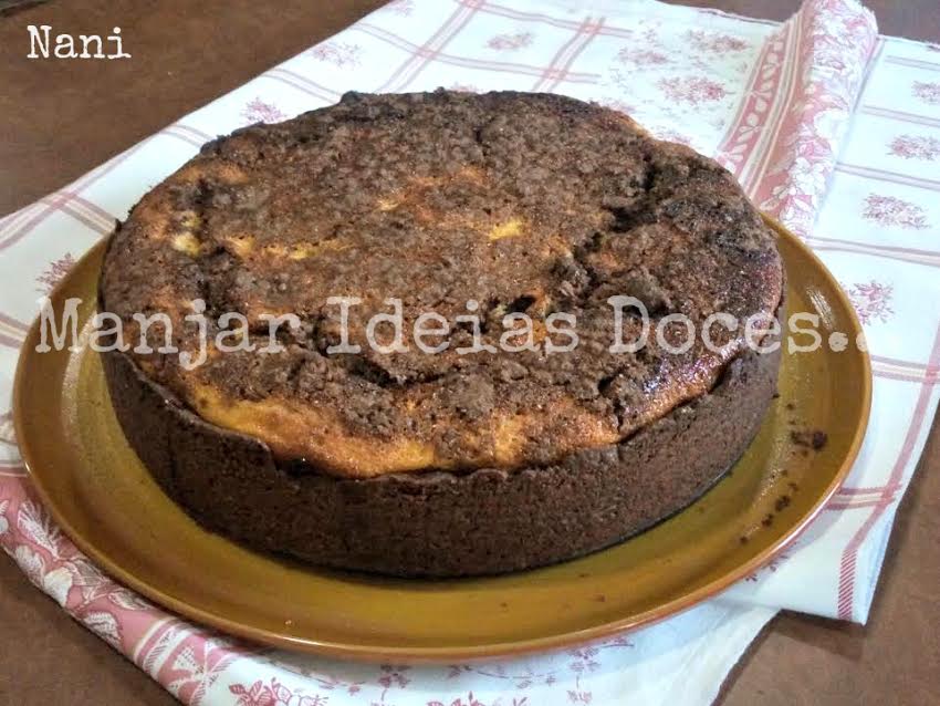 - Esfarele o resto da massa que reservou e espalhe por cima do bolo.