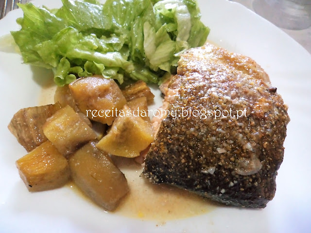 Porque, cá em casa, os gostos não são todos iguais tive de fazer este assado de peixe com batata doce (para mim) e batata normal para os restantes 🙂